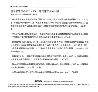 大阪府不動産コンサルティング協会が作成した「空き家管理マニュアル」が、共同通信社の取材を受け、日本経済新聞、産経新聞他全国各地の新聞で紹介されました。